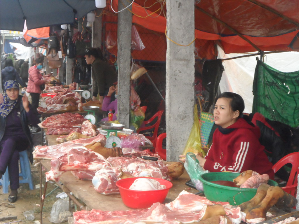 Dãy hàng thịt bò tại chợ Viềng Xuân Vụ Bản sáng mùng 8 tháng Giêng năm Canh Tý thưa vắng khách.