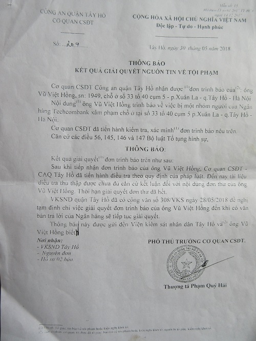 Sau đó 1 ngày (ngày 30/05/2018), Thượng tá Phạm Quý Hải, Phó Thủ trưởng cơ quan CSĐT - CA quận Tây Hồ đã ký Thông báo “Kết quả giải quyết nguồn tin về tội phạm” số 204 với nội dung như sau: “Sau khi tiếp nhận đơn trình báo của ông Vũ Việt Hồng, Cơ quan CSĐT - CAQ Tây Hồ đã tiến hành điều tra theo quy định của pháp luật. Đến nay tài liệu điều tra thu thập được chưa đủ căn cứ kết luận đối với nội dung đơn thư của ông Vũ Việt Hồng. Thời hạn giải quyết đơn thư đã hết.