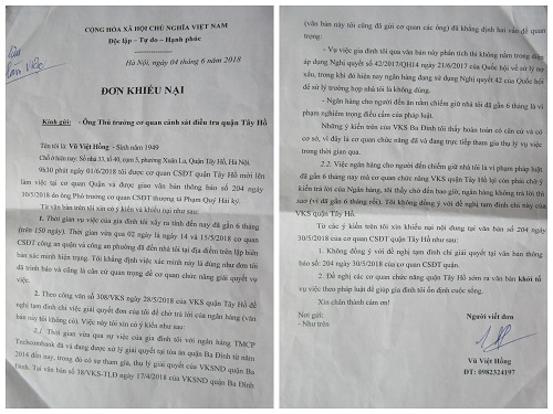 “Cơ quan CSĐT - CA quận Tây Hồ đã tiếp nhận được 02 đơn tố cáo của ông Vũ Việt Hồng - sinh 1949 trú tại địa chỉ số 33, tổ 40, cụm 5, Xuân La, Tây Hồ, Hà Nội gửi đến ông Chánh Thanh tra Bộ CA và 01 đơn Tố cáo của ông Hồng gửi đến Viện KSND quận Tây Hồ với nội dung: