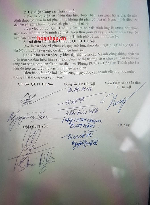 Kết thúc buổi làm việc, đại diện các ngành đều thống nhất sự việc có dấu hiệu hình sự, và chuyển toàn bộ tang vật, hồ sơ sang Cảnh sát điều tra (PC46), Công an Hà Nội để tiếp tục điều tra, xác minh theo quy định.