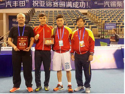 | Vũ Thành An cùng Ban huấn luyện trong niềm vui nhận huy chương tại giải vô địch đấu kiếm châu Á. |