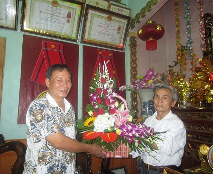 | Ông Pham Thanh Xuân được các đồng đội đến chúc mừng. |