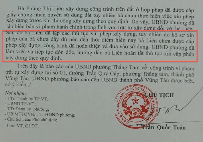Đối với công trình Khách sạn Kim Liên, số 01 Trần Quý Cáp, P.Thắng Tam, Tp.Vũng Tàu được xây dựng từ khi ông Toản đang làm Phó Chủ tịch phường, phụ trách xây dựng cơ bản, ông Toản đã tự ý cho ghép thửa, xây lấn lộ giới, xây quá chiều cao cho phép.