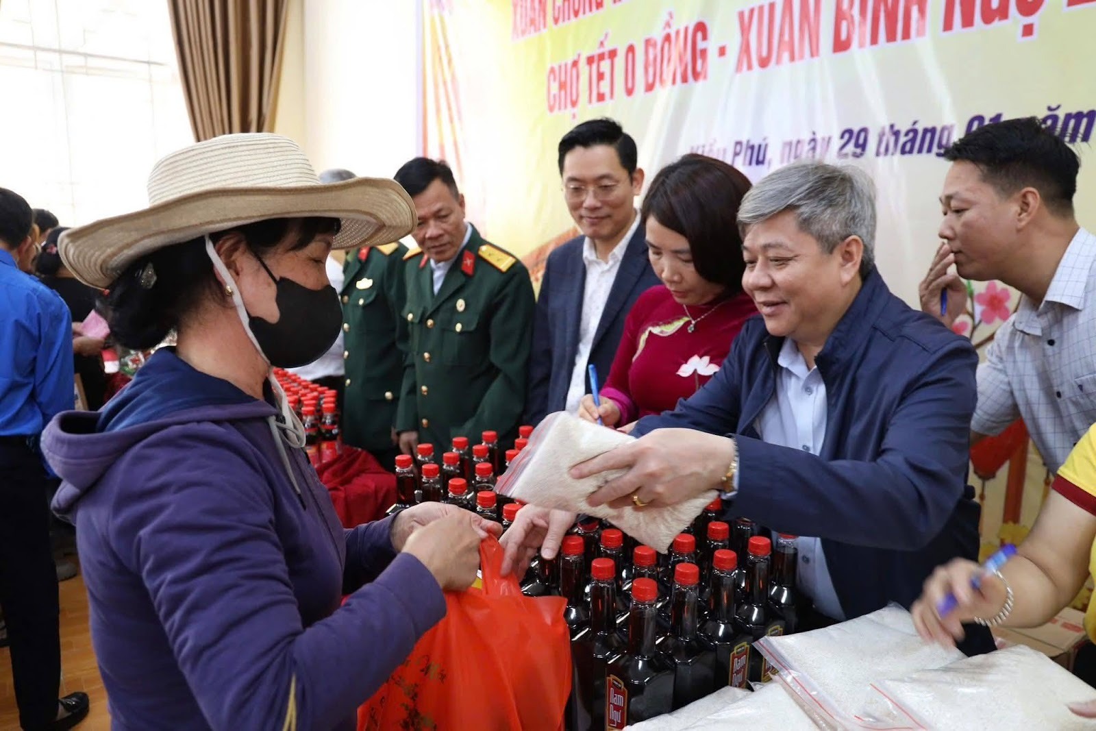 Các đồng chí lãnh đạo xã trao quà cho các đoàn viên, hội viên, người lao động, hộ cận nghèo, các gia đình có hoàn cảnh khó khăn tại chương trình.