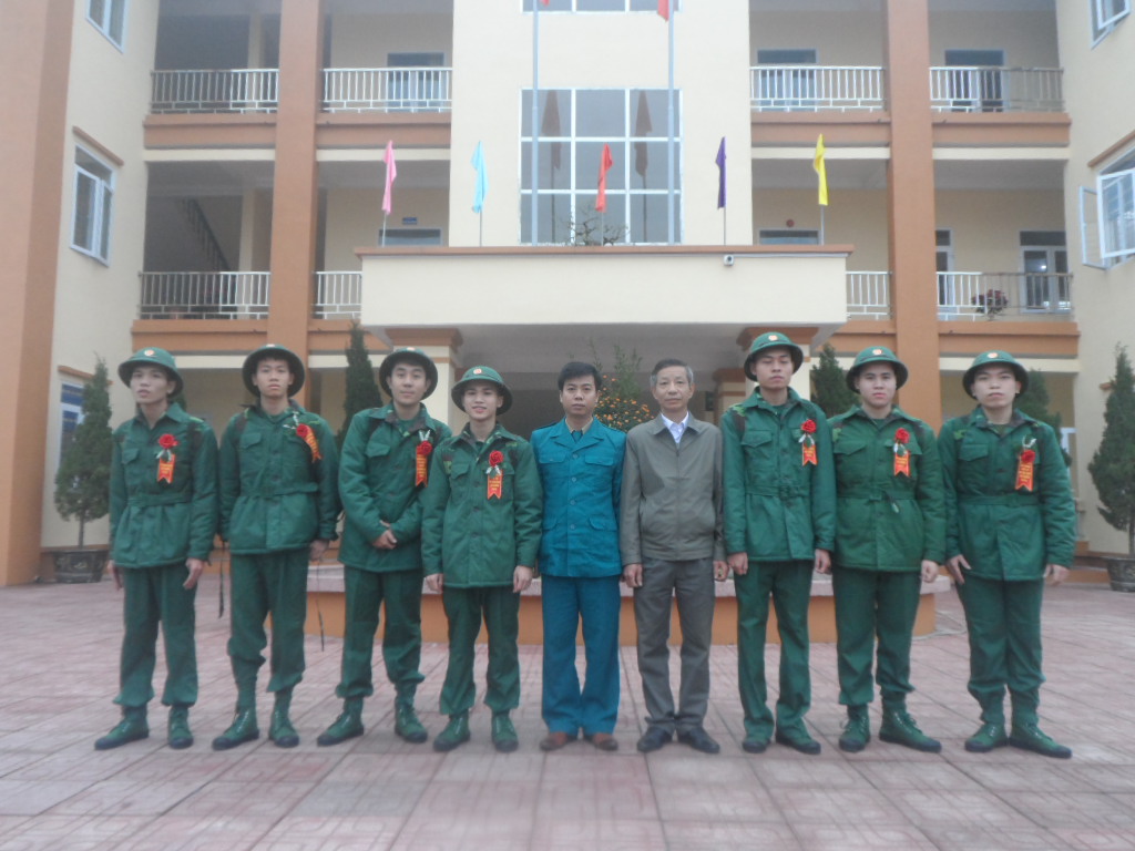 Ông Trần Đình Sơn, Bí thư đảng ủy xã cùng ông Bùi Trung Kiên, Chỉ huy trưởng Ban Chỉ huy quân sự xã Lộc An chụp ảnh lưu niệm cùng thanh niên trước khi lên đường nhập ngũ - Ảnh: Hồ Thanh