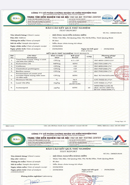 Vườn của gia đình ông Nguyễn Đăng Hiền đã có kết quả thử nghiệm của Trung tâm kiểm nghiệm FAO Hà Nội đạt tiêu chuẩn vệ sinh an toàn thực phẩm