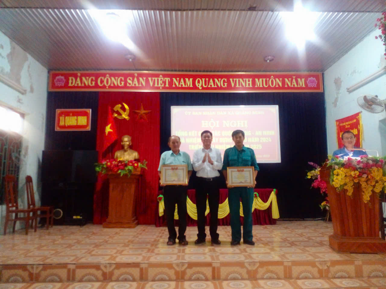 Tại Hội nghị, xã Quảng Minh đã khen thưởng cho tập thể và cá nhân đạt thành tích xuất sắc trong việc thực hiện tốt công tác Quốc phòng-An ninh năm 2024