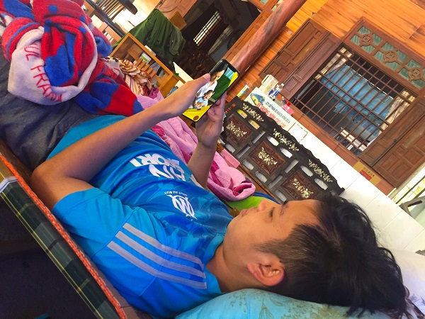 Trực chiến tại chốt kiểm soát giao thông, phòng chống dịch, vào những giờ nghỉ ca, Thượng úy Bùi Tấn Thành tranh thủ nhìn và hỏi thăm con qua điện thoại cho khuây khỏa nỗi nhớ nhung.
