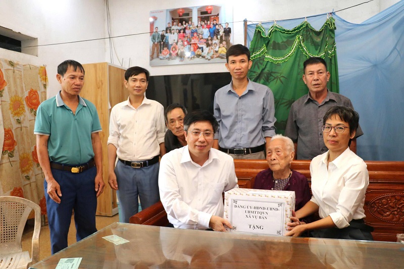 Ông Trần Văn Nghinh, Phó Bí thư Thường trực Đảng ủy xã cùng các lãnh đạo trong đoàn đến thăm và tặng quà cụ Trần Thị Xế, 100 tuổi ở thôn Pheo Tiền; cụ Trần Thị Thơm, 100 tuổi và cụ Trần Ngọc Sắc 102 tuổi cùng ở thôn Mới.