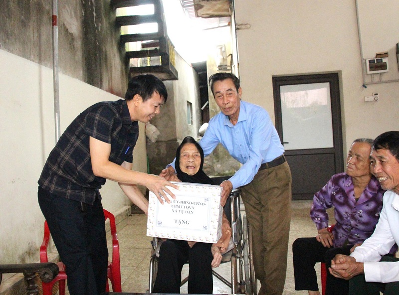 Ông Phạm Thành Lợi, Phó Bí thư Đảng ủy, Chủ tịch UBND xã cùng các lãnh đạo trong đoàn đến thăm và tặng quà cụ Trần Thị Hưng, 103 tuổi ở thôn Cầu Uông; cụ Phạm Duy Ninh 101 tuổi ở thôn Phú Thứ và cụ Trương Trọng Bảo, 100 tuổi ở thôn Phú Quảng.