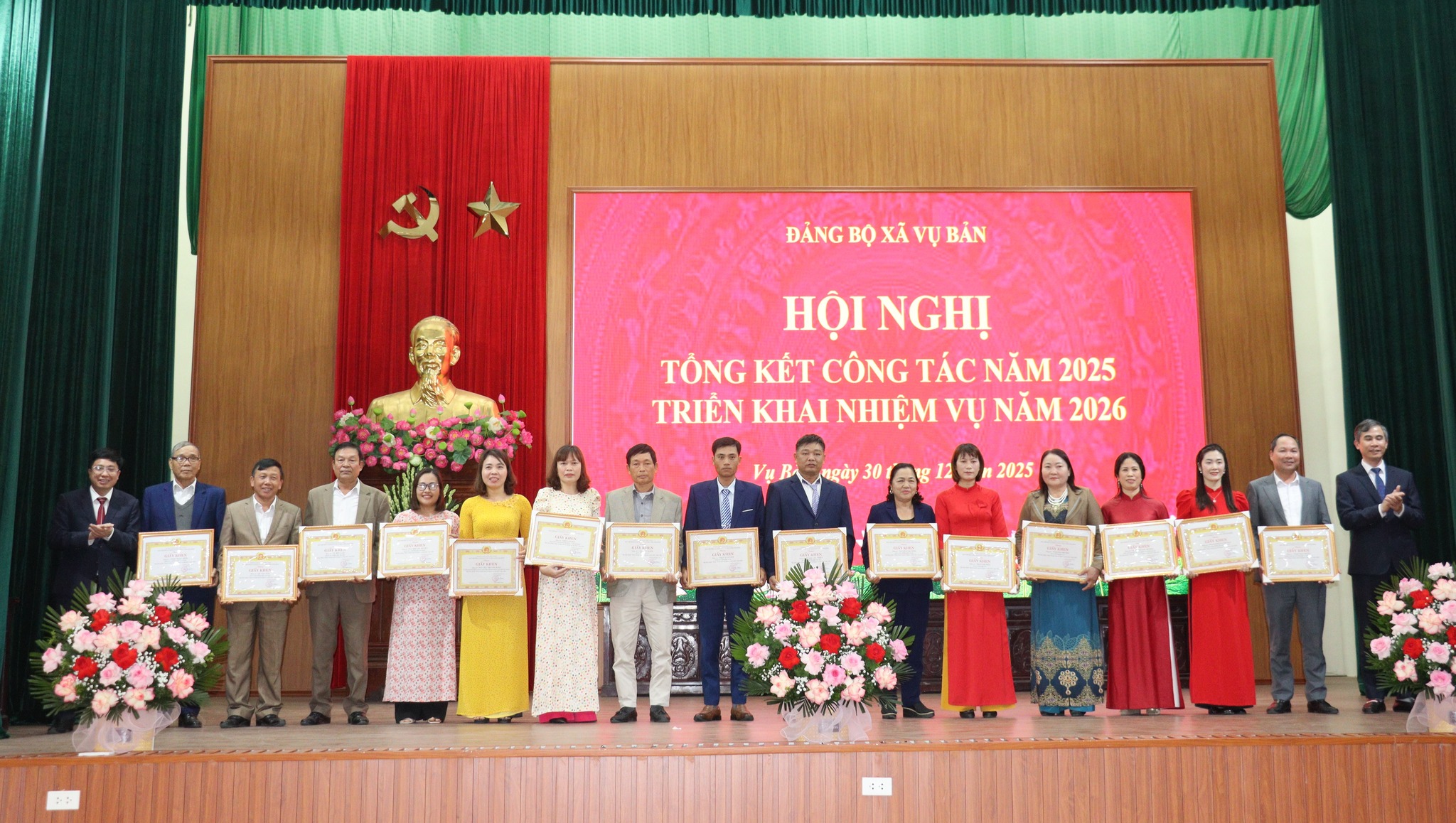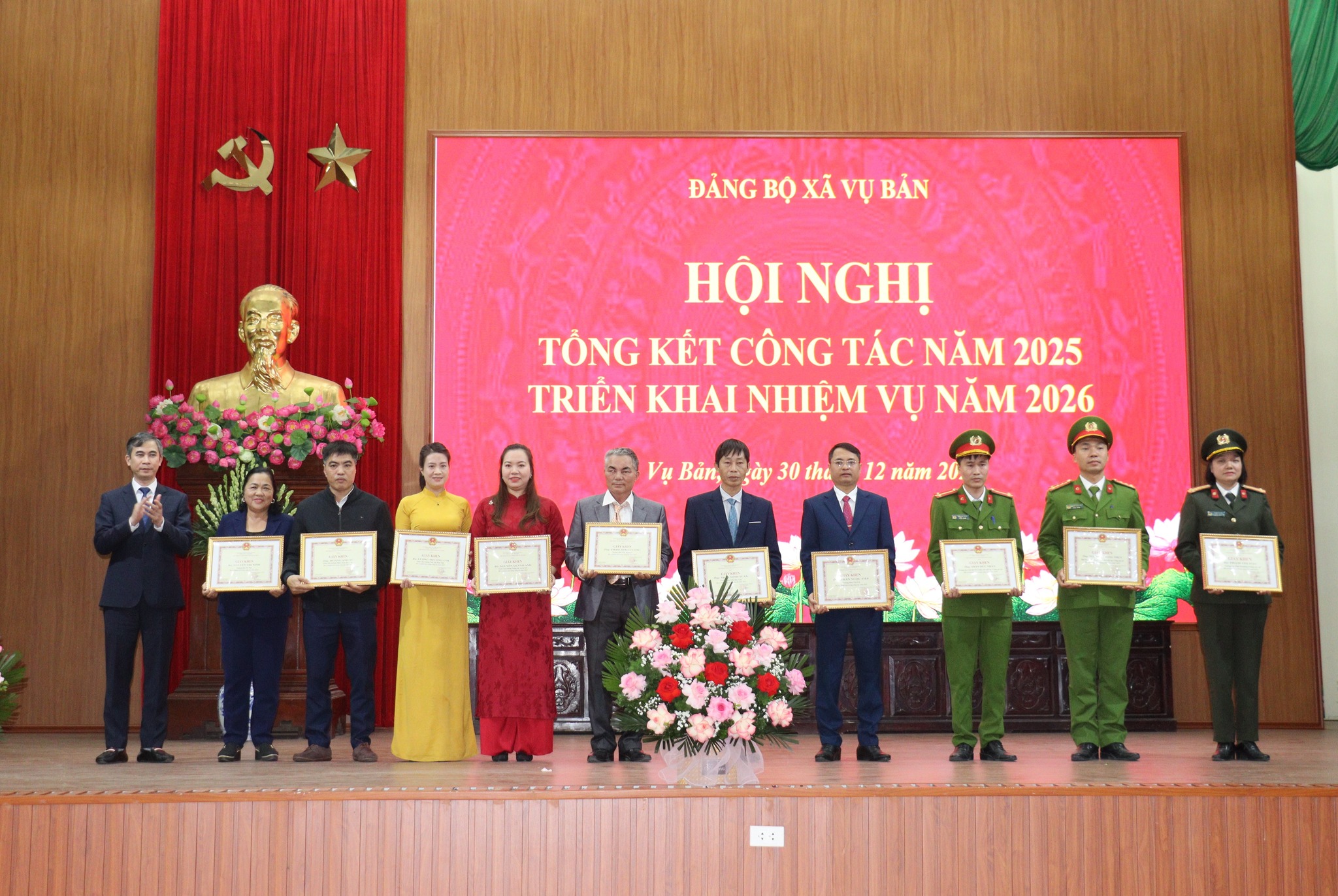 Nhân dịp này, Đảng ủy xã Vụ Bản tặng Giấy khen cho 9 tổ chức cơ sở Đảng và 48 đảng viên hoàn thành xuất nhiệm vụ năm 2025.