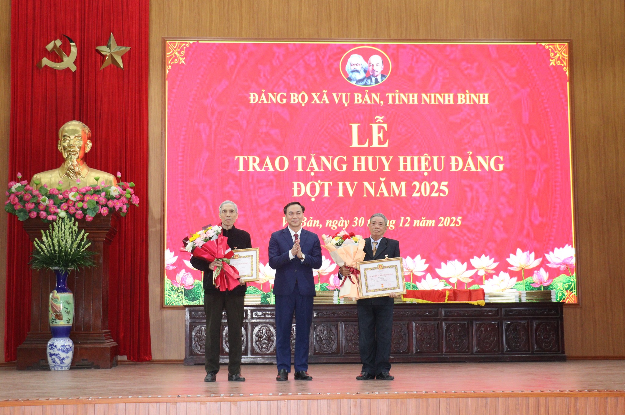 Tại hội nghị, Đảng ủy xã Vụ Bản đã trang trọng tổ chức Lễ trao huy hiệu Đảng đợt 7/11/2025 cho 17 đồng chí đảng viên, trong đó có 2 đồng chí được tặng huy hiệu 65 năm tuổi Đảng, 1 đồng chí được tặng huy hiệu 55 năm tuổi đảng, 1 đồng chí được tặng huy hiệu 50 năm tuổi Đảng, 6 đồng chí được tặng huy hiệu 45 năm tuổi đảng, 6 đồng chí được tặng huy hiệu 40 năm tuổi đảng và 1 đồng chí được tặng huy hiệu 30 năm tuổi Đảng.