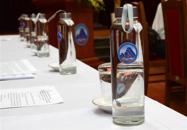 | Sử dụng chai thủy tinh đựng nước nhằm góp phần tuyên truyền ý thức bảo vệ môi trường trong các cuộc họp tại thành phố Đà Nẵng. (Ảnh: Quốc Dũng/TTXVN) |