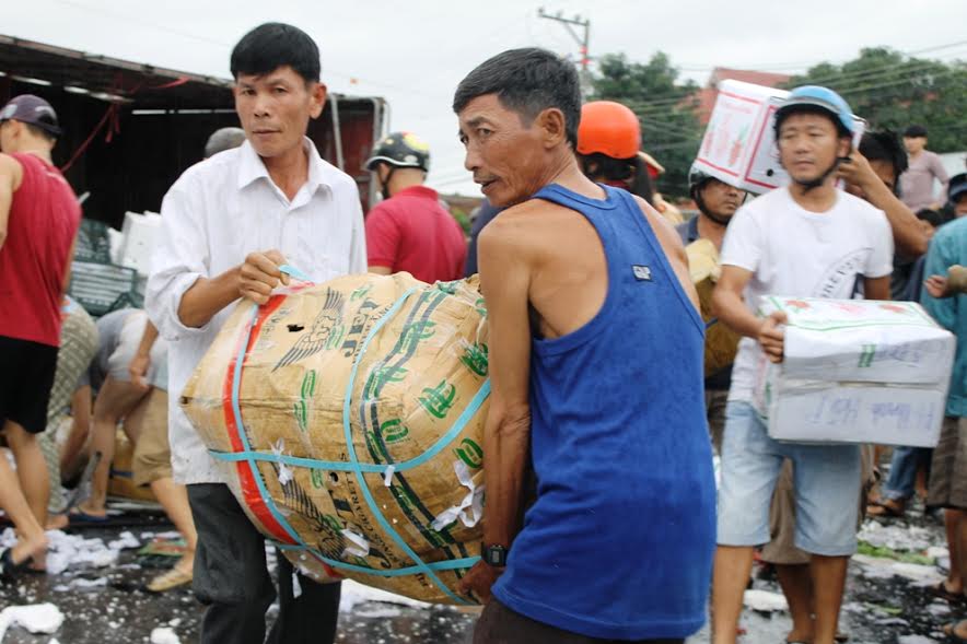 Sau vụ tai nạn xảy ra tại địa phận xã Cam Thành Bắc, huyện Cam Lâm (Khánh Hòa) làm cho cả 2 xe ô tô tải bị lật nghiêng. Thấy vậy, hàng trăm người dân không ngần ngại dầm mưa gom hàng giúp tài xế.