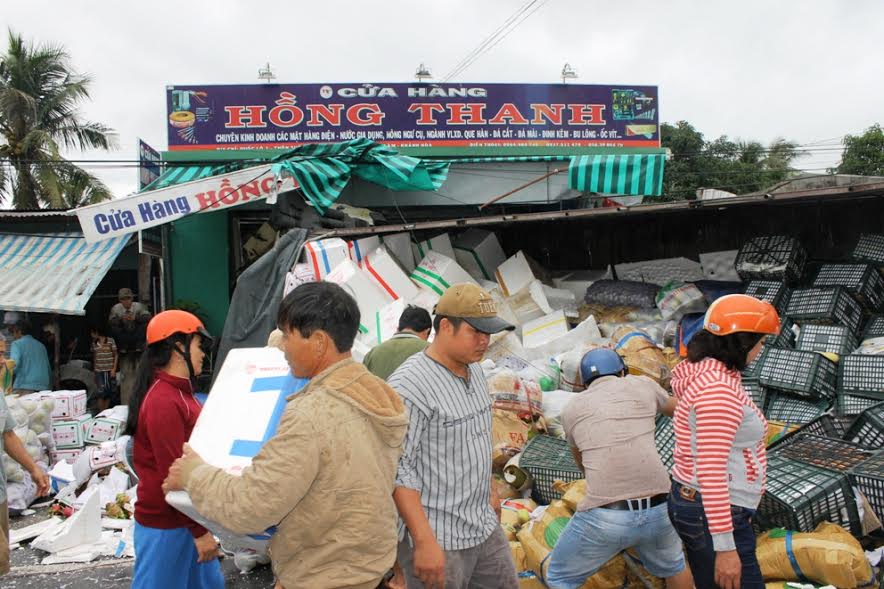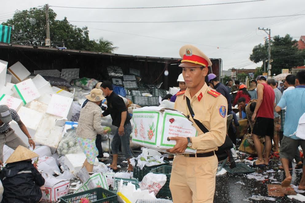 Anh Nguyễn Xuân Quý (thiếu úy CSGT huyện Cam Lâm, Khánh Hòa) cho biết, vừa đến hiện trường anh vừa tổ chức phân luồng giao thông, vừa cùng người dân vận chuyển trái cây vào lề đường. Theo anh Qúy, đây là nhiệm vụ của CSGT, giúp được phần nào thì giúp vì thiệt hại của chủ xe quá lớn. Hành động của anh làm cho hàng trăm người dân tại hiện trường hết sức cảm động.