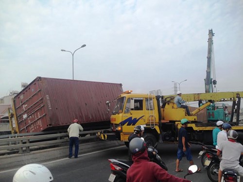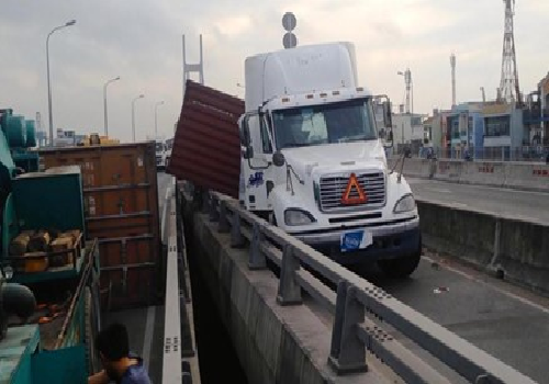 Theo đó, khoảng khoảng 5h30 sáng 4/4, chiếc xe container mang biển số 51C - 700.47 kéo theo rơ móc chở 2 thùng hàng (loại 20 feet), lưu thông trên cầu Phú Mỹ theo hướng từ quận 2 về quận 7.Khi đang đổ dốc cầu bên phía khu phố 1, phường Tân Thuận Đông, quận 7, TPHCM thì lạng tay láy lao qua phải, đâm vào thành cầu. Cú tông khiến chiếc xe bị lật nghiêng, hai thùng hàng văng ra khỏi xe, may mắn thời điểm xảy ra tai nạn không có phương tiện khác lưu thông qua.
