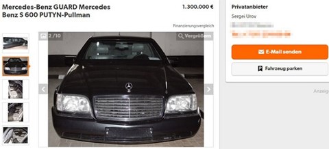 Tài khoản có tên Sergei Uvov trên trang mua bán mobile.de của Đức vừa rao bán một chiếc Mercedes-Benz S600 Pullman Guard đời 1994 với quảng cáo là từng được sử dụng để chở Tổng thống Putin.