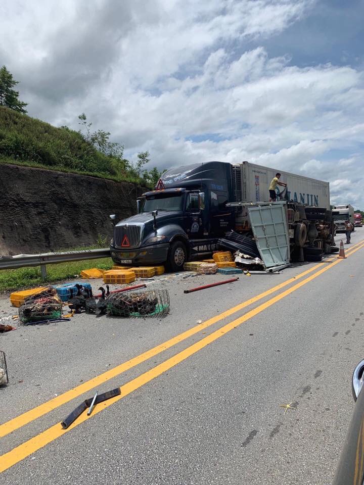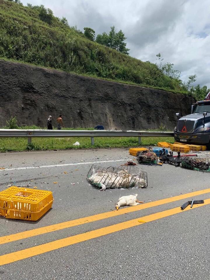 Tại hiện trường chiếc xe khách hư hỏng nặng nằm bên làn trái đường theo chiều di chuyển ban đầu, chiếc xe tải lật ngang đường biến dạng, nhiều gia cầm chết bay tung tóe khắp nơi.