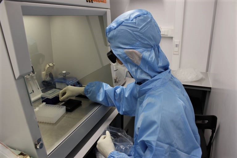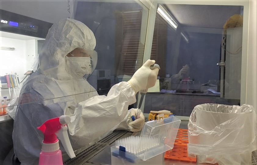 Nhân viên Trung tâm Nhiệt đới Việt – Nga tiến hành tách chiết xét nghiệm CVID-19 - Ảnh: Hồ Lê
