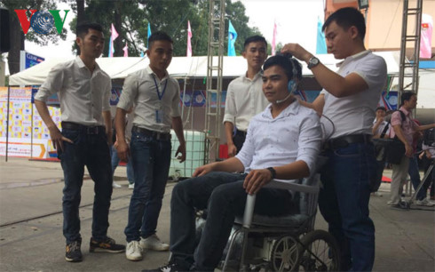 | Nhóm sinh viên thử nghiệm xe lăn thông minh. |