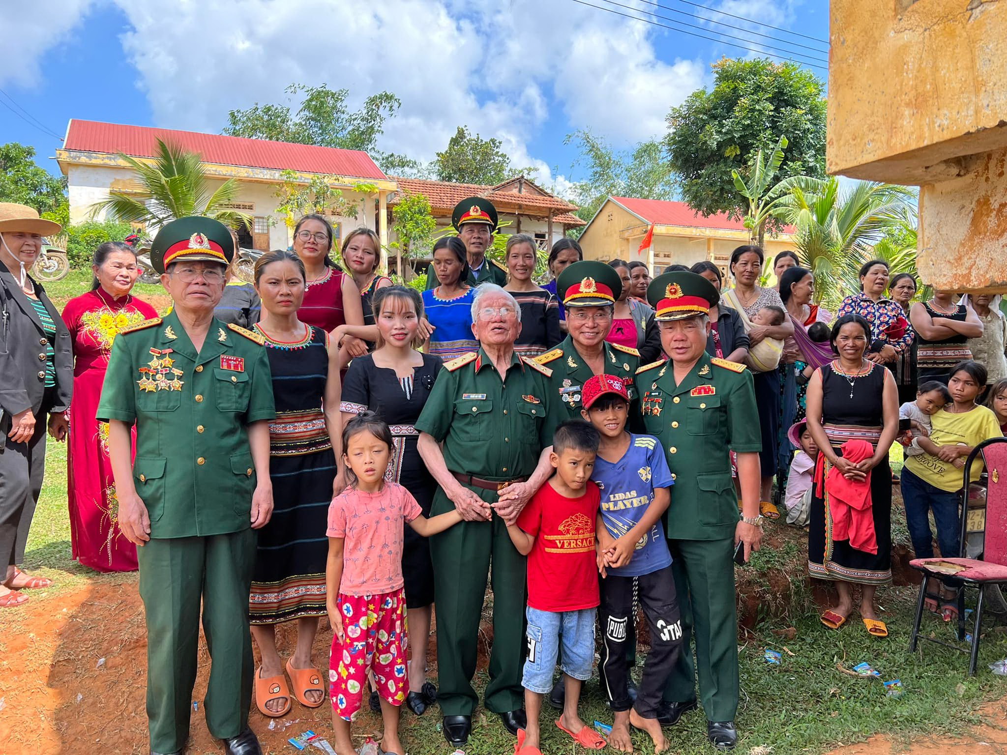 Trung tướng, AHLLVTND Khuất Duy Tiến và một số CCB Đại đoàn Đồng bằng chụp ảnh lưu niệm với bà con dân tộc xã Hơ Moong, Sa Thầy, Kon Tum