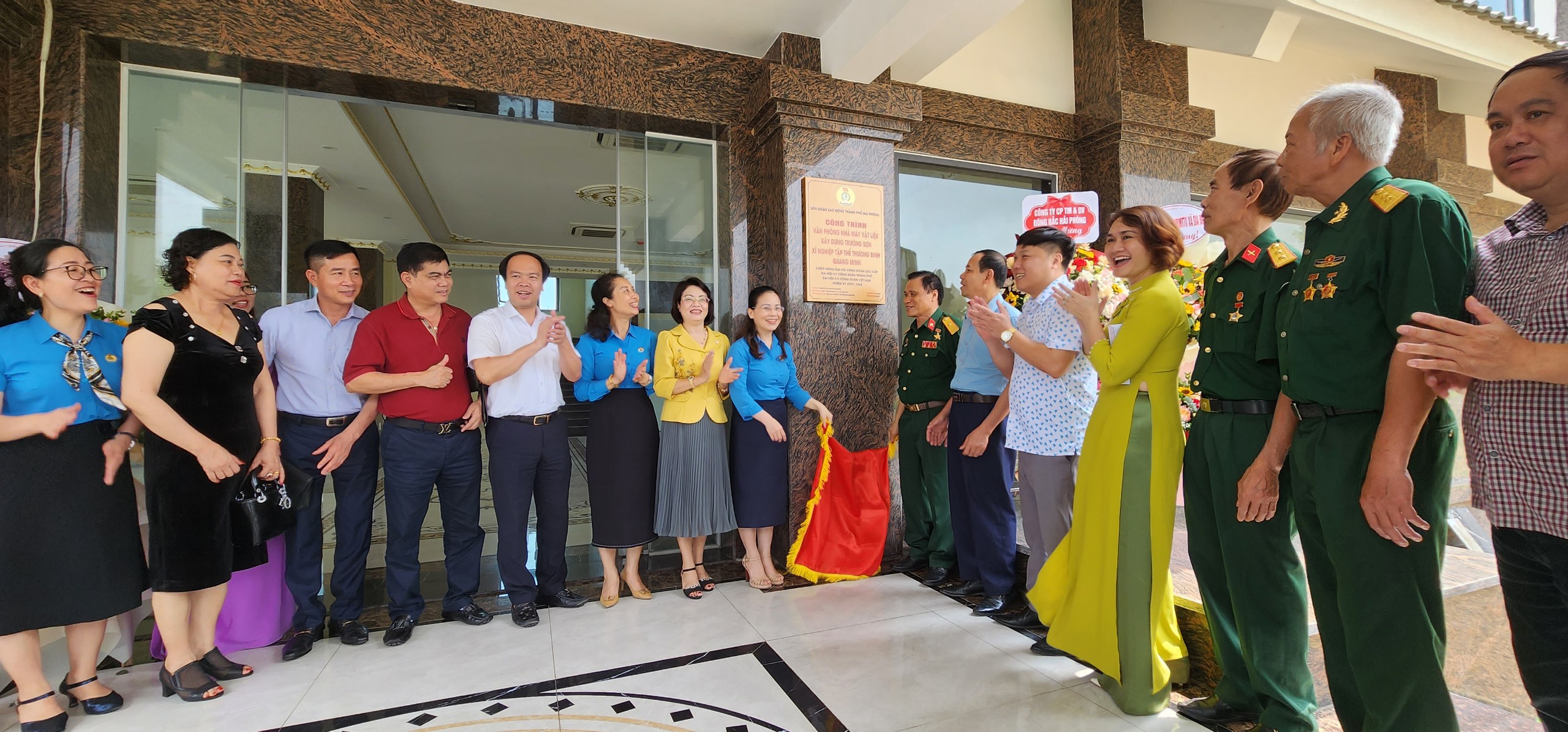 Phát biểu tại buổi lễ, ông Trần Hồng Quảng - Tổng giám đốc Xí nghiệp - Anh hùng Lao động thời kỳ đổi mới, cho biết: Công trình gắn biển chào mừng Đại hội Công đoàn các cấp được xây dựng tại Nhà máy vật liệu xây dựng Trường Sơn (Gia Đức, Thủy Nguyên) và hoàn thành vào tháng 3 năm nay. Đây là ngôi nhà 3 tầng, diện tích sàn 500m2, hiện đại, chính là điểm nhấn về kiến trúc, đáp ứng giá trị bền vững về kỹ thuật, mỹ thuật và công năng. Công trình được đưa vào khai thác, sử dụng sẽ góp phần cải thiện điều kiện làm việc của người lao động, đáp ứng yêu cầu ngày càng phát triển của Xí nghiệp. Đồng thời, công trình còn là niềm vui, là niềm tự hào của cán bộ, công nhân viên Xí nghiệp. Với ý nghĩa đó, Xí nghiệp sẽ làm tốt công tác bảo vệ, phát huy tối đa giá trị công năng nhằm đem lại hiệu quả tốt nhất. Tổng Giám đốc cũng bày tỏ tình cảm trước sự quan tâm của các cấp ủy Đảng, chính quyền, các ban, ngành, đoàn thể; Liên đoàn Lao động thành phố, Liên đoàn Lao động quận Ngô Quyền…