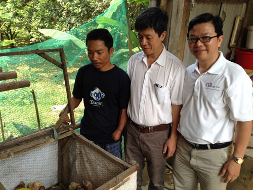 | PGS-TS Nguyễn Xuân Bả (giữa) trong một buổi đi chuyển giao kỹ thuật chăn nuôi gà cho một gia đình cựu chiến binh ở thị xã Hương Trà, tỉnh Thừa Thiên - Huế |