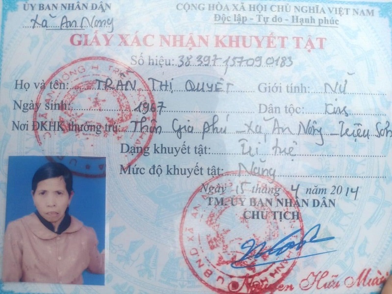 Giấy xác nhận khuyết tật của chị Trần Thị Quyết con gái cụ Tuất.