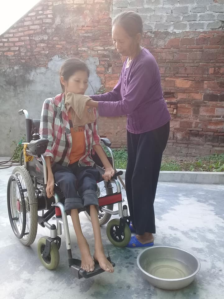 | Bà Hoa đang vệ sinh cá nhân cho con gái bị mắc bệnh teo cơ bẩm sinh.T.T |