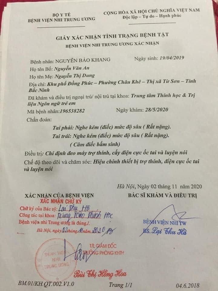 Giấy xác nhận tình trạng bệnh tật của bé Nguyễn Bảo Khang (Ảnh: Vietnamnet)