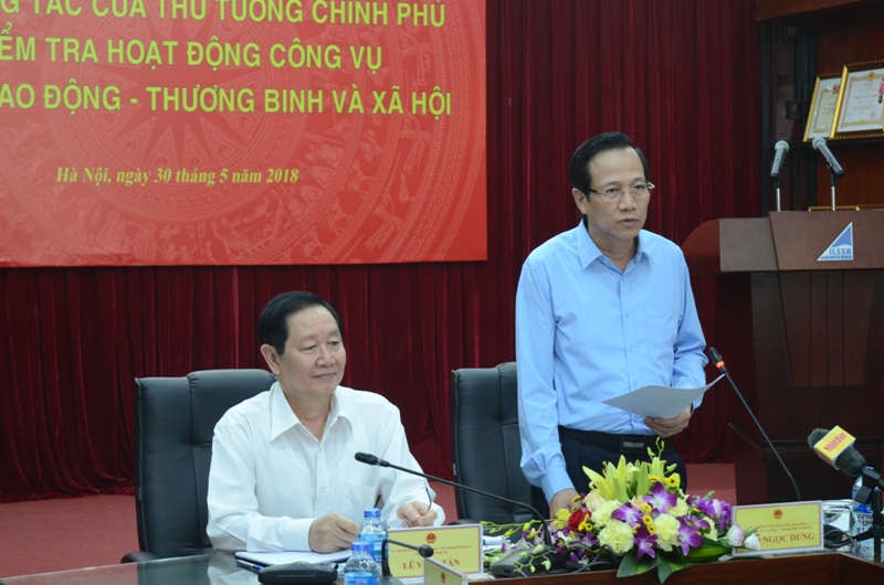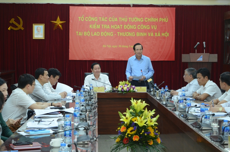 Chiều 30/5, Bộ trưởng Bộ LĐ-TB&XH Đào Ngọc Dung và các Thứ trưởng Doãn Mậu Diệp, Lê Quân, Nguyễn Thị Hà, cùng các đơn vị thuộc Bộ đã có có buổi làm việc với Tổ công tác của Thủ tướng Chính phủ, do Bộ trưởng Bộ Nội vụ Lê Vĩnh Tân, Tổ trưởng tổ công tác làm trưởng đoàn, cùng Phó Chủ nhiệm văn phòng Chính phủ Nguyễn Xuân Thành, Thứ trưởng Bộ Nội vụ Nguyễn Duy Thăng, lãnh đạo Thanh tra chính phủ, và các thành viên tổ công tác… nhằm kiểm tra hoạt động công vụ tại Bộ LĐ-TB&XH.