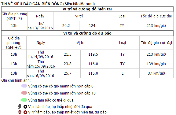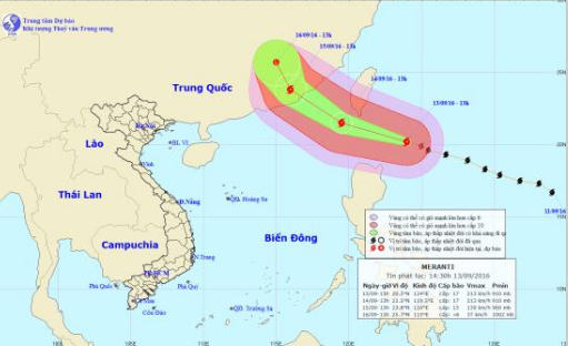 Dự báo trong 24 giờ tới, bão di chuyển theo hướng Tây Tây Bắc, mỗi giờ đi được khoảng 20km. Đến 13 giờ ngày 14/9, vị trí tâm bão ở vào khoảng 21,5 độ Vĩ Bắc; 119,5 độ Kinh Đông, trên vùng biển phía Đông Bắc Biển Đông. Sức gió mạnh nhất ở vùng gần tâm bão mạnh cấp 17, giật trên cấp 17.