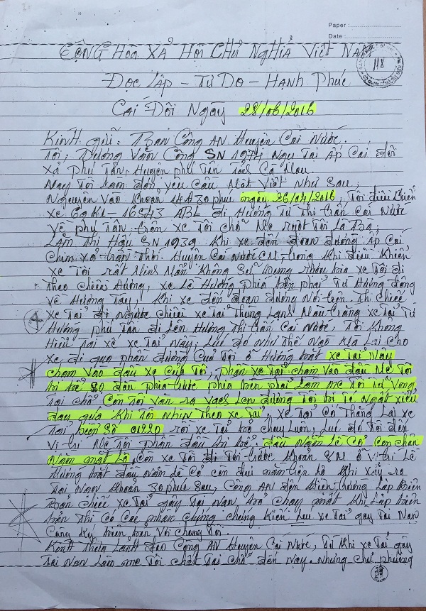 Trong quá trình theo dõi vụ án TNGT xảy ra tại ấp Cái Chim, xã Trần Thới, huyện Cái Nước, tỉnh Cà Mau, chúng tôi đã thu thập được một số tài liệu, chứng cứ quan trọng, có thể coi đây là tình tiết mới, góp phần giúp các cơ quan chức năng làm sảng tỏ những khuất lấp của vụ án. Đó là Tờ tường thuật của thượng úy Trịnh Văn Tèo- Công tác tại Phòng CSGT Công an tỉnh Cà Mau: Vào ngày 1/6/2016, được sự phân công công tác của Ban Chỉ huy Phòng, tuần tra kiểm soát tuyến Cái Nước- Phú Hưng, thời gian từ 13h30- 18h. Trong khi tuần tra lưu động trên tuyến và địa bàn, đến khoảng 15h thì tiến hành dừng tại ấp Đức An, Phú Hưng, Cái Nước, Cà Mau để kiểm tra các phương tiện. Khoảng 15h10 nhận tin báo từ người dân có vụ TNGT gây chết người tại xã Trần Thới, huyện Cái Nước, tỉnh Cà Mau, do xe tải 69C-020.12 gây ra. Tổ tuần tra tiến hành kiểm soát các phương tiện chạy hướng từ Cái Nước đi Cà Mau đến khoảng 15h30 thì có dừng phương tiện, biển số tương tự 69C-012.20 hướng từ Cái Nước đi Cà Mau. Qua kiểm tra sơ bộ phương tiện từ trước ra sau (đầu đèn, cản trước, phía sau và tất cả xung quanh bên ngoài xe) thì không thấy có biểu hiện khả nghi và có báo cáo với Tổ trưởng và tiếp tục cho phương tiện lưu thông. Như vậy, Tổ tuần tra không phát hiện xe ô tô tải 69C-012.20 có dấu hiệu gây ra vụ TNGT chiều ngày 1/6/2016.