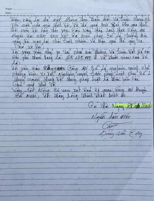 | Đơn của ông Dương Văn Công gửi Công an huyện Cái Nước. |