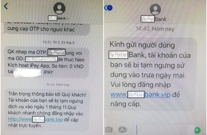 Các loại tin nhắn thường có dạng: “Trân trọng thông báo tới quý khách! tài khoản của bạn sẽ bị tạm ngưng dịch vụ vào ngày 1 tháng 11. Quý khách nhanh chóng đăng nhập vào http://www.***bank.top để cập nhật trực tuyến” hoặc “Kính gửi người dùng ***Bank, điểm tài khoản của bạn đã được đổi thành điều kiện quà tặng. Vui lòng đăng nhập www.***bank.vip ngay để đổi quà. Nếu quá hạn, nó sẽ không được chấp nhận”…