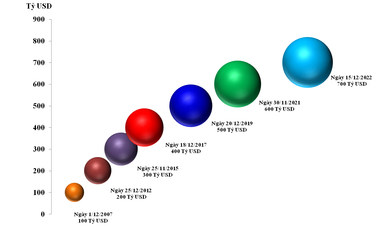 Thời điểm ghi nhận các mốc kỷ lục của xuất nhập khẩu hàng hóa của Việt Nam từ năm 2007 đến năm 2022. Nguồn: TCHQ