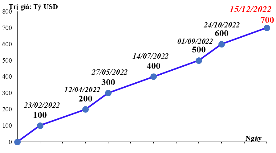 Tiến trình xuất nhập khẩu hàng hóa của Việt Namcán mốc 700 tỷ USD trong năm 2022. Nguồn: TCHQ