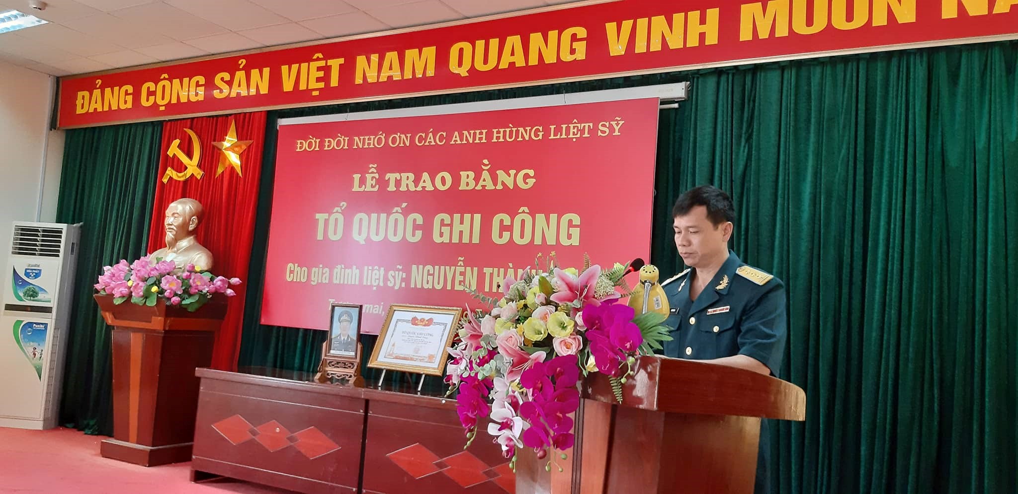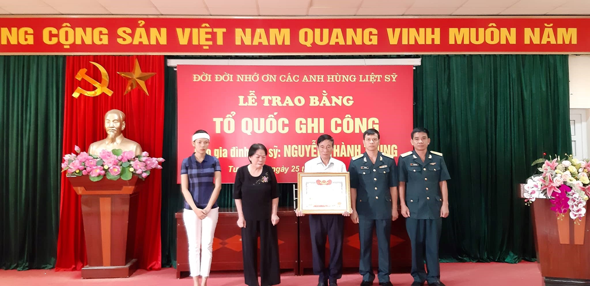 HOANHAP.VN - Ngày 25 tháng 7 năm 2019, tại trụ sở Uỷ ban nhân dân phường Tương Mai, quận Hoàng Mai, Thành phố Hà Nội, đã tổ chức Lễ Công bố Quyết định của Thủ tướng Chính phủ và Trao bằng “Tổ quốc ghi công” cho gia đình Liệt sĩ Nguyễn Thành Trung – Thiếu tá, Phi công, thuộc Trung tâm Huấn luyện, Binh đoàn 18, Bộ Quốc phòng.