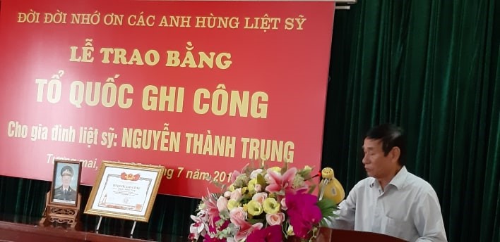 Đại diện thân nhân Liệt sĩ Thiếu tá Nguyễn Thành Trung gồm bố, mẹ và vợ lên nhận bằng Tổ quốc ghi công. Có mặt tại buổi lễ, mọi người ai nấy đều xúc động, gia đình thân nhân của liệt sĩ vẫn đau đáu nỗi đau mất đi người con, người chồng, người cha kính yêu. Hình ảnh người bố của đồng chí nghẹn ngào chậm rãi phát biểu lời cảm ơn, người mẹ không ngừng rơi nước mắt, hình ảnh người vợ trẻ cùng 2 đứa con thơ dại.