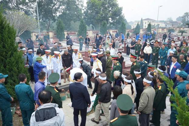 Đại diện lực lượng dân quân tự vệ, đoàn viên thanh niên cùng hội cựu chiến binh và bà con nhân dân đưa hài cốt liệt sĩ là nghĩa trang liệt sĩ tại địa phương.