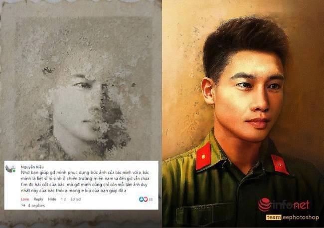 Gia đình chị Hoàng Thanh (Hà Nội) có bố tham gia kháng chiến và hy sinh. Nhiều lần đem ảnh đến tiệm để làm ảnh thờ nhưng do tấm ảnh chụp từ năm 1959, hình in trên giấy lụa phóng to ra, có nét kẻ ca rô trên gương mặt nên thợ ảnh không phục chế được. May mắn Team Lee đã phục hồi lại rất đẹp và trang trọng.