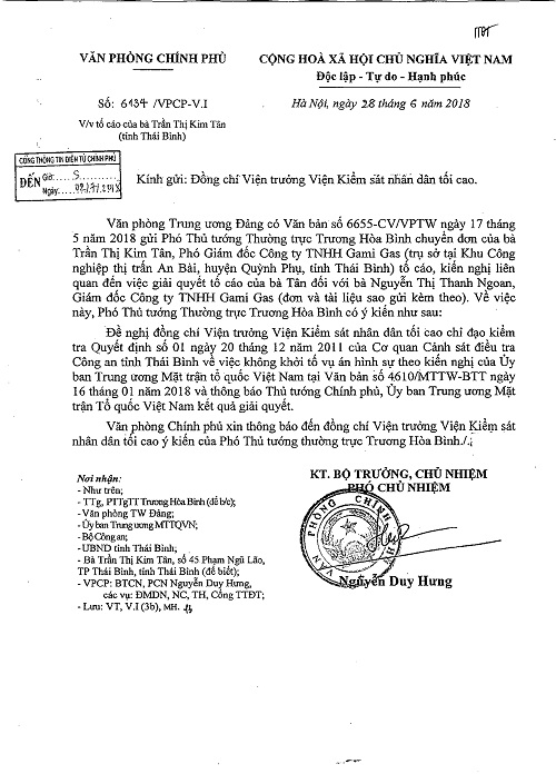 Công văn số 6134/VPCP-V.I có đoạn ghi: “Văn phòng Trung ương Đảng có Văn bản số 6655-CV/VPTW ngày 17 tháng 5 năm 2018 gửi Phó Thủ tướng Thường trực Trương Hòa Bình chuyển đơn của bà Trần Thị Kim Tân, Phó Giám đốc Công ty TNHH Gami Gas (trụ sở tại Khu Công nghiệp thị trấn An Bài, huyện Quỳnh Phụ, tỉnh Thái Bình) tố cáo, kiến nghị liên quan đến việc giải quyết tố cáo của bà Tân đối với bà Nguyễn Thị Thanh Ngoan, Giám đốc Công ty TNHH Gami Gas (đơn và tài liệu sao gửi kèm theo). Về việc này, Phó Thủ tướng Thường trực Trương Hòa Bình có ý kiến như sau: