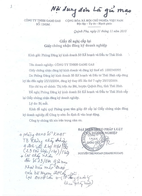 - Bà Ngoan gian dối khi lập Phụ lục Hợp đồng đối trừ nợ với Công ty Liên Quảng Thành, tự ý quy trách nhiệm cho bà Tân. Ngày 21/11/2010, bà Ngoan ký hợp đồng và chuyển nhượng toàn bộ Công ty TNHH Gamigas cho bà Ngô Thị Tuyết với số tiền 7.850.000.000đ; trong hợp đồng không thể hiện có phụ lục kèm theo. Ngày 23/11/2010, Sở KH&ĐT tỉnh Thái Bình đã cấp Giấy đăng ký doanh nghiệp đổi tên thành Công ty TNHH Gas Phú Hoàng An; Chủ tịch kiêm Giám đốc công ty là bà Ngô Thị Tuyết. Nhưng bà Ngoan và bà Tuyết sau khi chuyển giao công ty xong lại lập 03 bản phụ lục và 01 bản thanh toán tiền công nợ đề ngày 26/11/2010 (bà Ngoan vẫn ký với chức danh Chủ tịch Công ty Gamigas) với nội dung đối trừ tiền của bà Tân với tiền Công ty Liên Quảng Thành còn nợ, buộc bà Tân phải chịu trách nhiệm trả số tiền còn thiếu là 132.319.000đ và giao cho bà Tuyết có trách nhiệm thu hồi. Trong khi đó, Công ty Liên Quảng Thành là công ty có nhiều cổ đông, ông Văn là Chủ tịch HĐQT kiêm Giám đốc Công ty và là người đại diện theo pháp luật; bà Tân với chức vụ Phó Giám đốc Công ty Liên Quảng Thành chỉ là một trong số những cổ đông của Công ty.