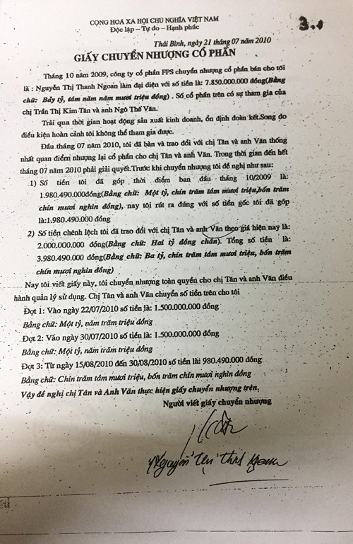 | Giấy chuyển nhượng cổ phần ngày 21/7/2010 của Bà Ngoan |