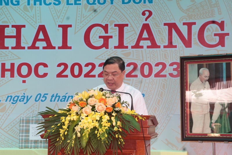 Phát biểu ý kiến, tặng hoa chúc mừng và đánh trống khai trường ông Phạm Gia Túc, Ủy Viên BCH Trung Ương Đảng, Bí thư Tỉnh ủy đã ghi nhận, biểu dương và chúc mừng những thành tích nổi bật trong công tác đào tạo và bồi dưỡng chất lượng học sinh giỏi mà trường THCS Lê Quý Đôn đã đạt được trong những năm qua. Ông tin tưởng rằng với bề dày truyền thống và thành tích cao trong giảng dạy và học tập, trường THCS Lê Quý Đôn sẽ tiếp tục nỗ lực cố gắng quan tâm đầu tư phát triển toàn diện công tác, nhiệm vụ trọng tâm và giành nhiều kết quả toàn diện nổi bật hơn nữa trong năm học mới này và những năm tiếp theo, góp phần tích cực và quan trọng vào thành tích GD - ĐT của đất học Nam Định.