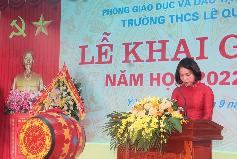 Bà Đào Thị Ngọc Hà - Hiệu trưởng trường THCS Lê Quý Đôn chia sẻ tại buổi lễ khai giảng của trường.