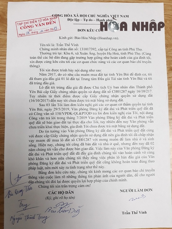 Trong đơn ông Vinh nêu rõ: “Năm 2017, do có nhu cầu mua đất tại tỉnh Yên Bái để định cư, ông Trần Thế Vinh đã tham gia đấu giá và trúng 1 lô đất tại Trung tâm đấu giá tài sản tỉnh Yên Bái. Lô đất này đã được Chủ tịch Ủy ban nhân dân thành phố Yên Bái cấp Giấy chứng nhận quyền sử dụng đất số CH01287 ngày 16/10/2017 do Phó Chủ tịch Nguyễn Yêu Hiền ký”. Tuy nhiên, kể từ ngày được cấp giấy chứng nhận đến nay, ông Vinh vẫn chưa được bàn giao mặt bằng đất để sử dụng.