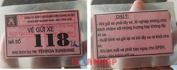 Qua ghi nhận, trên vé xe có ghi Công ty Cổ phần Đầu tư Xây dựng Dân dụng Hà Nội, Xí nghiệp QLKDDV Nhà (Quản lý kinh doanh dịch vụ) KĐT Yên Hoà. Trên mỗi vé này chỉ ghi mã số, mặt sau chỉ ghi một số quy định khi gửi xe. Mỗi lần gửi xe, khách sẽ phải trả 5.000đ/1 lượt.