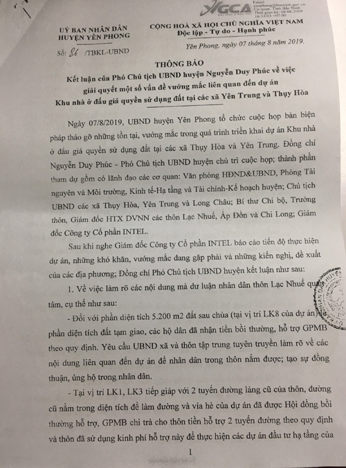 Ngày 10/8/2018, UBND tỉnh Bắc Ninh đã có Quyết định số 456/QĐ-UBND về việc phê duyệt kết quả trúng đấu giá quyền sử dụng đất ở dự án Khu nhà ở đấu giá QSDĐ tạo vốn thôn Lạc Nhuế, xã Thụy Hòa và thôn Ấp Đồn xã Yên Trung, huyện Yên Phong cho Công ty Cổ phần Intel.