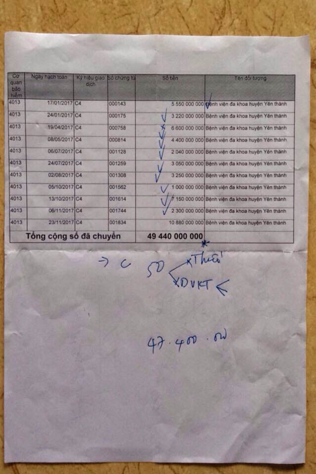 Để làm rõ “vướng mắc” nói trên, phóng viên Tạp chí điện tử Hoa Nhập đã tìm đến Bảo hiểm xã hội (BHXH) huyện Yên Thành. Tại đây, phóng viên được bà Hoàng Thị Chín- Giám đốc BHXH huyện Yên Thành giải thích và chứng minh rất rõ ràng về trách nhiệm của ngành BHXH trong việc chi trả chế độ BHYT cho bệnh nhân. Tính đến ngày 23/11/2017, BHXH huyện Yên Thành đã có 11 lần chuyển khoản cho Bệnh viện đa khoa huyện Yên Thành với tổng số tiền lên tới gần 50 tỷ đồng, trong đó có số tiền công khám, phẫu thuật, thủ thuật do BHYT chi trả cho 36 Trạm Y tế cấp xã đến hết quý 3/2017.